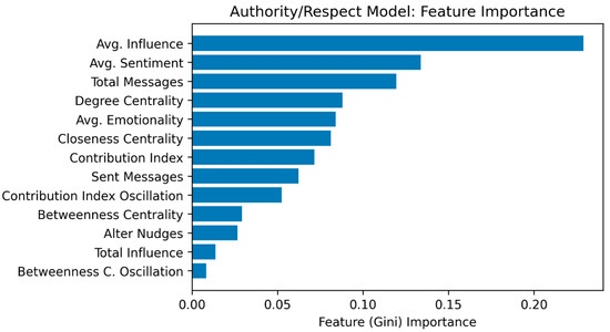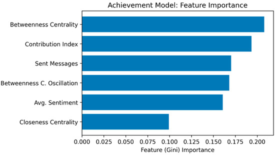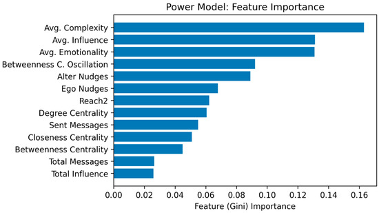 In terms of Schwartz’s Values, modeling results show, for example, that the importance of power for people is predictable by the language metrics of complexity, emotionality, and influence per message (Figure 5). Beyond that, the second value of the dimension self-enhancement, which is achievement, can be predicted through the signals of betweenness centrality, contribution balance, and the number of sent messages (Figure 6). Both models for predicting an individual’s relevance of power and achievement perform well, with an accuracy of 0.714 on the test set. Furthermore, both models perform well during CV, with an accuracy of 0.858 when predicting power and an accuracy of 0.793 when predicting achievement.