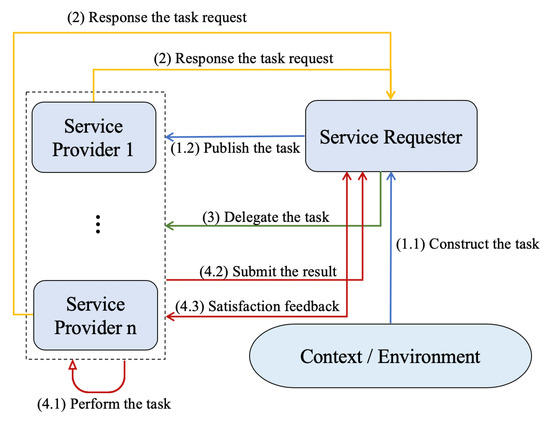 Figure 1. The first step that the SR will perform is to determine the content of the task, including the context, property and goal. It will also publish the task request information. Then, after receiving the message of the task request, the SPs will determine whether to respond to the request by evaluating the trustworthiness of the SR. If the SR is trustworthy from the perspective of the SP, the SP will send a respond message which contains the task price, which is calculated by considering the cost of the task performance. After receiving some response, the SR will delegate the task to the specific SP based on the trust model and the consideration of utility. Then, the delegated SP will perform the task and submit the result. After receiving the result of the task from the delegated SPs, the SR and SP will evaluate each other about their behaviors and update the trust model.
