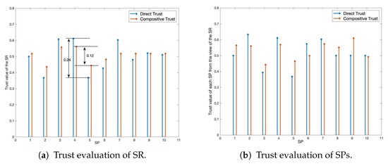 Figure 5a, compared with the direct trust evaluation results of each SP, the compositive trust evaluation results for SR have less difference and more comprehensive opinions, which reflects that the evaluation method based on subjective logic can better integrate the recommendations from different sources so that most SPs can have a more consistent evaluation for SR. Similarly, as shown in