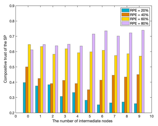 Figure 7, when the number of the recommenders is 0, it indicates that the trust value of SP to form the viewpoint of the SR is completely evaluated based on direct experience. Along with the number of recommenders gradually increasing, the SR can collect more recommendation opinions. From the experimental results of this group, it can be seen that when the number of recommendation opinions is equal to or greater than 6, the SR’s trust evaluation opinion on SP tends to be stable, and the SR can more accurately identify the honest and trustworthy SP while avoiding wrongly delegating malicious or negative SPs. Therefore, in order to better evaluate the trustworthiness of the SP, the SR needs to obtain as many recommendations from intermediate nodes as possible during the service delegation process.