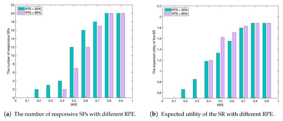 Figure 8 shows the number of responsive SPs and benefits of the SR when the RPE is from 10% to 90% for a certain task. It can be seen that when the RPE is less than 0.5 and the RTS is large, there are more negative opinions referenced. Therefore, the trust evaluation result of SR from the viewpoint of SPs is generally low, and few SPs respond. Therefore, the SR cannot select a suitable SP, and the income is low. With the increase in RPE, the trustworthiness of the SR increases and the number of responding SPs gradually increases, so the SR can obtain a better delegation scheme, which improves the overall revenue. In addition, in the case of small RPE, although the expected benefit of SR is higher when the RTS is lower (the reason is that some SPs cannot correctly estimate the trustworthiness of SR, resulting in a wrong response to the service), it may lead to lower service quality of SPs and failure to guarantee the benefits of SPs. Higher RTS will lead to more accurate bidirectional evaluation results, and more SPs choose not to respond to the service request when RPE is low. On the other hand, in the case of higher RPE, higher RTS will make the bidirectional evaluation between SPs and SR more accurate, so the overall benefit of the SR will be higher.