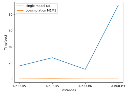 Figure 6 and Figure 7 show the co-simulation processing time when coupling the same or different models. We conclude that the co-simulation of models is faster than the unique model or . On the other hand, during data exchange between models we proceed to post and read best solutions for each interacting model. Instead of sending the best solution as a sequence of routes, we choose to send it as separate edges with their pheromone trail. After the execution, we observe that this action has a significant impact on the behavior of the model in constructing its solution and the model builds better solutions quickly. In addition, it does not spend a lot of time interchanging data and occupies a reasonable memory size to store the best solution.