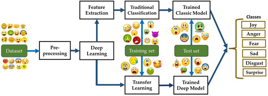 Figure 1 shows the framework for image-based emoji classification. Initially, the dataset of emoji images collected from the Internet is preprocessed, and resized to fit the input of the deep models. Then, deep learning is employed for both of our classification approaches: classical algorithms, where deep learning (DL) is used to extract the features, and transfer learning. In the first approach, the Alexnet and ResNet-18 deep models are used to extract features from the dataset, chosen among others because of their wide use in the literature for this purpose [29,30,31,32]. Such DL-extracted features from the two models are then independently provided as input features to train and test each traditional supervised classifier, as shown in the upper part of Figure 1. The lower part of Figure 1 displays the re-training for knowledge transfer of the pre-trained deep classifiers using transfer learning, fine-tuning emojis in the last three fully connected layers of the models pre-trained with DL. Different parameters are applied to train the traditional and deep classifiers according to their parameter settings (see Section 3.4). These two approaches are compared to classify emojis pictograms into the Ekman model of six basic emotion classes.