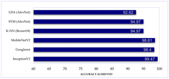 This section shows the results of the deep neural networks tested. GoogleNet, MobileNetV2, and InceptionV3 perform better than AlexNet and SqueezeNet. We achieved the highest accuracies 97.86%, 96.04%, 98.40%, 98.61% and 99.47% with AlexNet, SqueezeNet, MobileNetV2 GoogleNet and InceptionV3, respectively. The training of these neural networks is performed with three different training optimizers, namely adam, sgdm, and rmsprop. Table 1 shows the details of the experiments performed by varying training functions and learning rates to fine-tune the deep models. The loss for InceptionV3 is lower compared to other tested deep models. The highest accuracy (99.47%) is achieved by the InceptionV3 model with Adam optimizer and a learning rate of 0.0001, while GoogleNet with the training function rmsprop and a learning rate 0.0001 achieves the highest performance of 98.40%. On the other hand, MobileNetV2 perform slightly better compared to GoogleNet and achieved an accuracy of 98.61% with a learning rate of 0.001, and the sgdm optimizer. The possible reason for the highest accuracy achieved with InceptionV3 could be the number of layers in the model. InceptionV3 contains more layers than GoogleNet and AlexNet. AlexNet achieves the highest accuracy of 97.86% with the training function adam and a learning rate 0.00001. Another important observation is that for both AlexNet and InceptionV3, the highest accuracy is achieved with Adam, while GoogleNet and SqueezeNet achieve the highest accuracy with rmsprop. Only MobileNetV2 that achieved the second-highest accuracy with the sgdm optimizer. The learning rate is an important hyperparameter: In particular, AlexNet and SqueezeNet achieve the lowest accuracy 16.67% at a learning rate of 0.01, which is due to an unstable training process. If we decrease the value assigned to the learning rate, we achieve better performance as shown in Table 1. Overall, InceptionV3 performs the best, and SqueezeNet performs the worst among all five tested deep classifiers.