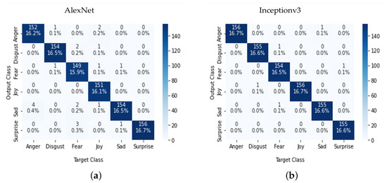 The performance analysis of InceptionV3 and AlexNet can be committed using the confusion matrices shown in Figure 3a,b to show overall performance and performance by class. InceptionV3 achieved an overall highest accuracy of 99.47% among five tested deep classifiers, while AlexNet achieved 97.86%. InceptionV3 perfectly classified all images in the Joy and Anger classes, while AlexNet misclassified several images. In addition to the confusion matrix of the best-performing network, it is interesting to observe the confusion matrix of the deep model with low performance.