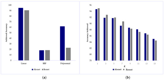 SVM and K-NN Performance: (a) Shown on the left, the performance of SVM for different kernels while, (b) the right side shows the performance of K-NN for different values of K on ResNet-18 and Alexnet deep features.