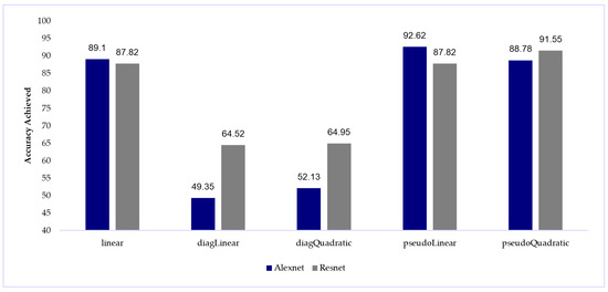 LDA was trained using five different discriminants, i.e., ‘linear’, ‘diagLinear’, ‘diagQuadratic’, ‘pseudoLinear’ and ‘pseudoQuadratic’. Experimental results in Figure 5 show achievement of the highest accuracy 92.62% by LDA with discriminant of type pseudoLinear, and Alexnet features. Through ResNet-18 features, we achieve the highest accuracy 91.55% with the pseudoQuadratic discriminant. On the other hand, discriminant types ’diagQuadratic’ and ’diagLinear’ performed poorest, both on Alexnet and ResNet-18 features.