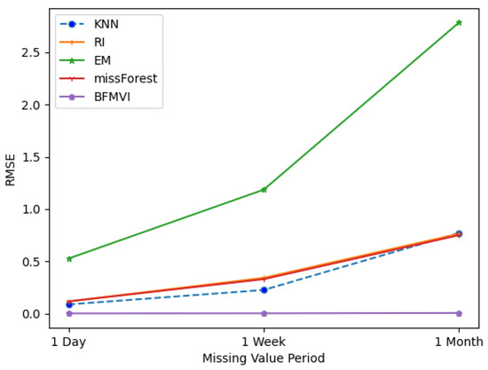 We also assessed the performance of the imputation techniques on missing data occurring over a consecutive period of time {1 day, 1 week and 1 month} as seen in Table 2 and Figure 3. In general, across all imputation tasks examined in this paper, BFMVI illustrates a reliable performance in handling the different rates and characteristics of missing data considered in this study as opposed to the other imputation techniques.