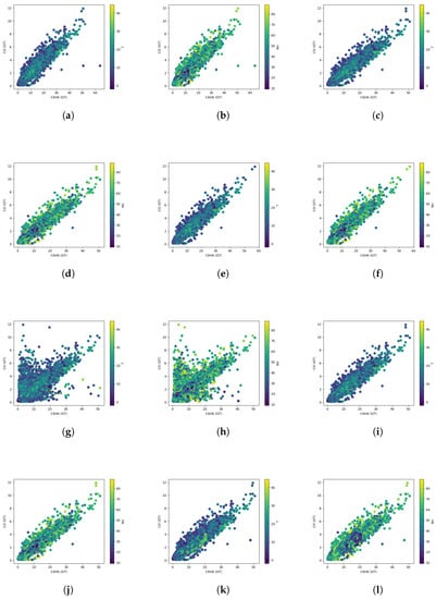 Scatter plot showing the effect of various imputation techniques on the sensor data color-coded with Temperature (T) and Relative Humidity (RH) meteorological factors: (a,b) Original data, (c,d) kNN Imputation, (e,f) Regression Imputation, (g,h) EM Imputation, (i,j) missForest Imputation and (k,l) BFMVI.