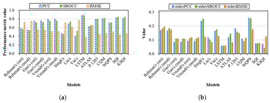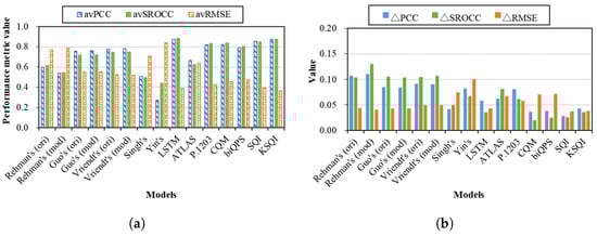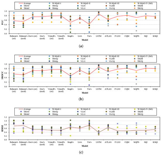 Figure 1 shows the performance of all the models corresponding to different databases, where the red line indicates the average performance of each model. With respect to the performance variations, it is clear that, for most of the models, their performances vary significantly across databases. For Rehman’s (ori) model, the PCC value can be as high as 0.93 in case of the W-SQoE-I database but can also be as low as 0.29 in case of the VL13 database. More drastically, variations in PCC can be observed with Singh’s, Yin’s, and biQPS models. On the other hand, the performances of the LSTM, SQI, and KSQI models are relatively stable with PCC values in [0.63, 0.96]. From Figure 1b,c, the performances in terms of RMSE and SROCC also show the similar trend to that of PCC.