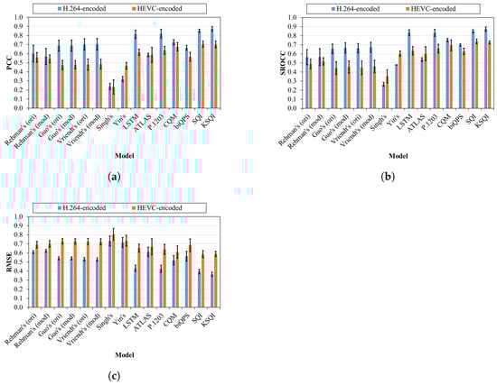 Average performances of individual QoE models over H.264-encoded set and HEVC-encoded set. (a) PCC; (b) SROCC; (c) RMSE.