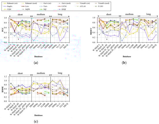 Performances of individual QoE models across different databases. (a) PCC; (b) SROCC; (c) RMSE.