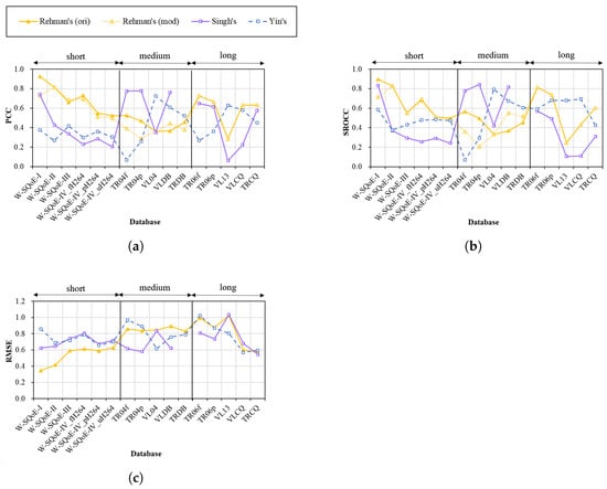 Performance of Rehman’s, Singh’s, and Yin’s models in the first group over the test databases. (a) PCC; (b) SROCC; (c) RMSE.