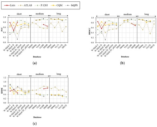 Performance of Liu’s, ATLAS, P.1203, CQM, and biQPS models in the second group over the test databases. (a) PCC; (b) SROCC; (c) RMSE.
