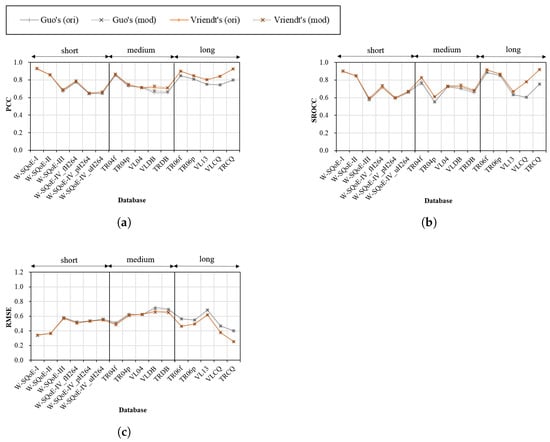 Performance of Guo’s and Vriendt’s models in the third group over the test databases. (a) PCC; (b) SROCC; (c) RMSE.