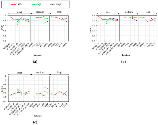 Performance of the LSTM, SQI, and KSQI models in the fourth group over the test databases. (a) PCC; (b) SROCC; (c) RMSE.