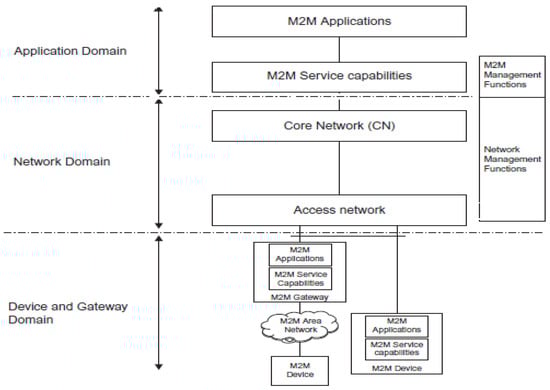 The general M2M architecture is divided into three interconnected domains called the M2M domain, the network domain and the application domain. The main constituents of this architecture can be described as follows: