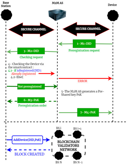 A pre-shared key (PsK) used for registration of a device in Figure 5 can be generated by the M2M application server after verification of the nonexistence of the device in the blockchain. PsK is sent to the device via a secure channel, or automatically stored in the devices during the initial configuration of the device (prior to deployment) and communicated to the M2M application server via a secure channel.