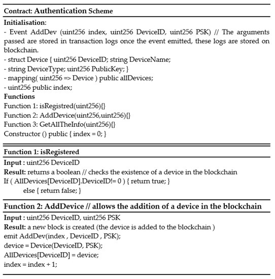 The device ID is transferred via a secure channel to be appended in the private blockchain using the deployed smart contract in Figure 6. First it checks the existence of the device in the blockchain using the function IsRegistered() from the smart contract, after that the node can be appended to the blockchain only if it does not already exist by calling the function AddDevice().