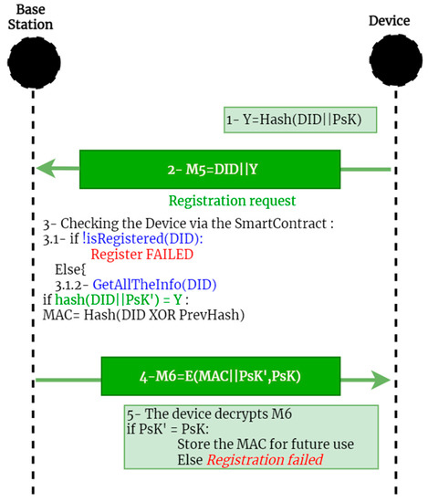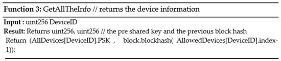 Step 3: The base station checks the existence of the device in the blockchain, and if it does not exist, the registration is refused. In the other case, function 3, “GetAllTheInfo”, in Figure 8 from the smart contract is called to get the device information. The BS computes hash(DID||PsK) and compares it to Y, and if the comparison holds, it computes the MAC as follows: MAC = Hash(DID XOR PH), where PH is the previous hash of the block, which contains the identifier of the device (if the device is stored in the block I, PH would be the hash of the block i−1).