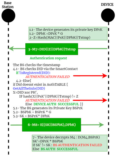 The authentication of any device takes place with a valid Message Authentication Code (MAC) because the smart contract is deployed on all base stations, and allows finding the hash of the precedent block that contains the identifier of the device. This mechanism brings more security to the network. The authentication phase is composed of seven steps (Figure 9) depicted as follows: