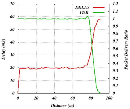 The simulation results illustrated by the graph in Figure 12 show that the overhead delay increases with the evolution of the distance. In our experimentation, 92 m is the maximum distance covered by the device radio; over longer distances (d > 92 m), the packet delivery ratio (PDR) becomes equal to zero. The reason is that the transmission power of 0 db corresponds to a communication range of approximately 87 to 92 m.