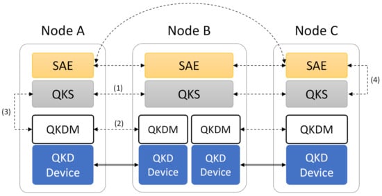 - Quantum Key Distribution (QKD): Protocol and Data Format of REST-Based Key Delivery API; Technical Report; European Telecommunications Standards Institute (ETSI): Nice, France, 2019.