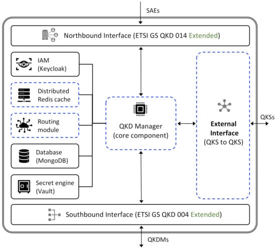 When a QKDM registers to a QKS, a QKDM Registration Process (QRP) takes place with Keycloak (QSS uses Keycloak [14] as its Identity and Access Management service) (accessed on 7 April 2022). The QRP can start only if the QKDM is available as a Keycloak user. Therefore, for authentication purposes, a registration of the QKDM to Keycloak is mandatory; only afterwards the QKDM can be configured by a system administrator and the QRP can start through the Southbound Interface. First, the QKDM sends a registration request to the QKS, providing information regarding reachable destinations and the underlying QKD device. Then, the QKS grants the QKDM limited access to the Vault instance and the DB. This process enables the QKDM to store keys in an isolated portion of the QKS resources.