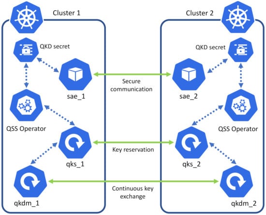 To add the functionalities of a QSS in a Kubernetes cluster, as we describe in Section 4.1, we used the operator pattern (Section 2.2). A set of Kubernetes clusters could be imagined as nodes of a QKD network, and each one integrates a QSS as an operator. This strategy allows applications to treat the QSS as a native resource that could exploit its functionalities without significant changes.