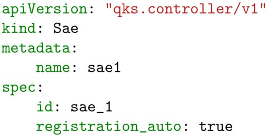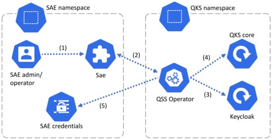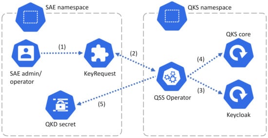 As mentioned in Section 2.2, an operator is a software extension to Kubernetes, which leverages CRs and controllers following the control loop pattern. Therefore, we could create additional CRs to map out SAEs and key requests in Kubernetes. Then, using custom controllers, we could add a logic behind events of the life-cycle related to those resources (e.g., creation, removal, update). We defined two CRs, Sae and KeyRequest, and developed the QSS Operator to operate them. All the components of the classical QSS, such as QKS and QKDM, are available as deployments applied to the Kubernetes cluster.