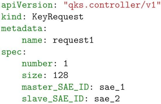 Once two registered SAEs want to exchange a key, a resource of type KeyRequest needs to be created. In particular, the SAE admin/operator again is in charge of applying the resource (Figure 5), specifying as parameters the key length, the number of keys required, mSAE, and sSAE. The workflow (depicted in Figure 7) is similar to the previous case of SAE registration: the QSS operator detects the creation of the KeyRequest resource, authenticates the SAE through Keycloak, requests the key material to the QKS, which starts the KRP and retrieves the key material to the QSS operator, and stores the final keys as a Kubernetes secret.