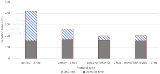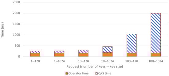 In our first test (Figure 8), we collected data regarding the execution time related to the application of a KeyRequest type resource. This takes into account the time for the QKS to perform the getKey operation, which is the greediest in terms of time requested, and all other operations performed by the QSS operator that are labelled as “QSS operator time” (Figure 7). Varying the number of keys requested and the length of those keys, we observe an expected growth in terms of time required for the QKS to perform the getKey, while the time of the operator remains constant. Even if all the required keys are already available in Vault, we need to consider that the getKey operation has to perform the KRP according to the number of keys requested and then extract those keys from Vault, whose time depends on both the number and length of the required keys. We covered the part of the optimisation regarding the length of keys in Vault, yet there is the necessity to tackle the multiple requests factor. In order to optimise that aspect, we already adopted the asynchronous approach (Section 3.1); indeed, the performance of the system, even considering the QKDM bottleneck, the fact that we used only one worker in Hypercorn for the tests, and only one replica of the QKS in Kubernetes, are already satisfying, i.e., for 100 keys of length 1024 the throughput is approximately 56 kbit/s. Since our system is modular and scalable, we could adjust the parameters above (e.g., Hypercorn workers, QKS replicas) according to the coming evolution of QKD devices and reach throughput far beyond the one reported in this paper.