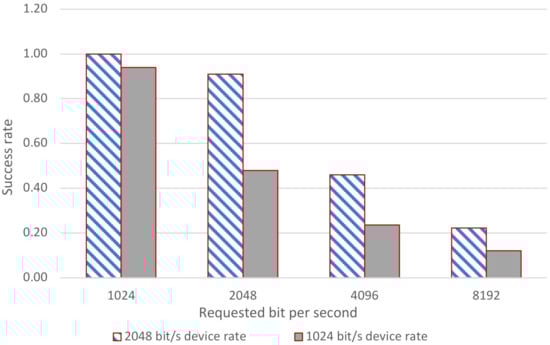 The second test, as depicted in Figure 9, shows the success rate of the KeyRequest depending on the underlying exchange rate. In order to perform the tests, we set first the throughput of the special purpose QKDM to 2 kbit/s, then to 1 kbit/s and varying the rate of the requests we tested the resilience of our solution. As we expected, we see in Figure 9 that using a 2 kbit/s low-level exchange and requesting 1 kbit/s of key material leads to 100% success in key exchanges. Maintaining this exchange rate and changing the low-level exchange rate to 1 kbit/s already leads to a success rate lower than 100%. Indeed, this happens with a certain probability because of some delay in producing the required keys. From an operator standpoint, this event results in a failure in retrieving the QKD secret, which could be solved by essentially forwarding the same request again. With the same method, we increased the requests per second, and according to what we expected, the success rate decreased accordingly. The bottom line is that when we vary the exchange and request rate, the system is resilient even if it cannot serve all requests. Besides, it notifies the upper level of the failure, letting the high-level application take consequent actions. When normal conditions are established again, the success rate returns to 100%.