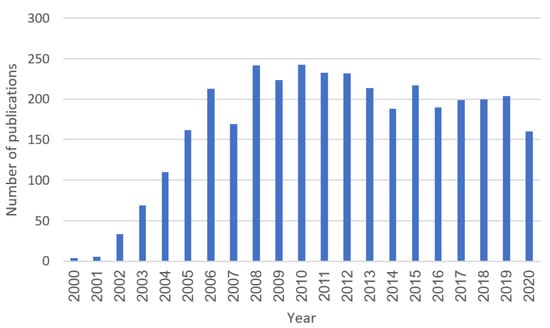 Figure 1 demonstrates the publication trend since the year 2000. Between 2003 and 2006, the number of studies increased dramatically, and approximately 83% of publications were published after 2006. The year with the most publications was 2010, with 243. The first four papers published in 2000 concentrated on the roles of XML and RFD in the development of semantic webs [66,67]. A significant finding was that the first decade (2000–2010) of interoperability and semantic web research can be considered the infancy stage. The second decade (2011–2020) saw a steady level of interest in this subject, as indicated by the slight ups and downs in the number of publications. This period may be referred to as the stabilization and consolidation stage, as growth appears to have reached maturity and saturation during the second decade.