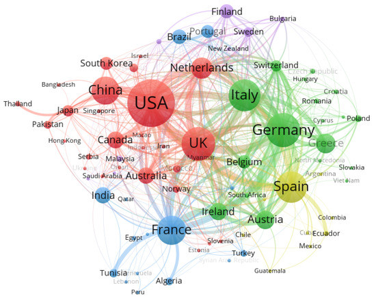 The international collaboration network for interoperability and semantic web research is depicted in Figure 2. The radius of each node in this network represents the number of publications in that country, while the edge represents the level of collaboration between countries. We can see from the network that the most productive country, the United States, has a strong research collaboration with the United Kingdom, Italy, and Switzerland. The USA also collaborates with countries such as Slovenia, Bulgaria, Denmark, and Austria on a smaller scale. In short, while researchers in the fields of interoperability and the semantic web are distributed globally, Africa and Asia continue to be underrepresented. This could be due to several factors, including the isolation of the scholars in these continents from the international scientific community (e.g., conferences), the possibility that their publications are in non-indexed journals, or that their research activities are being conducted in their mother tongue. International collaboration and joint research efforts with scholars from the most productive countries are therefore required to improve the quality of research output and advance the field of interoperability and the semantic web.