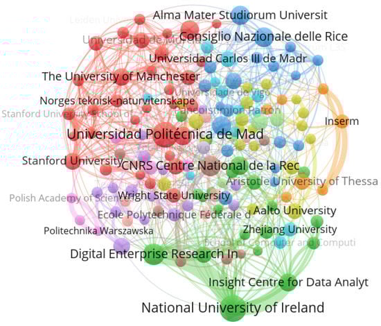 The network of institutional collaboration in the field of interoperability and the semantic web is depicted in Figure 3. The node size is proportional to the number of publications produced by each institution, whereas the thickness of the edges indicates the level of research collaboration. The network demonstrates that institutions are assigned to several research partitions based on the color scheme used. The largest cluster is red, with 32 institutions spread across North America, Europe, and Asia. Universidad Politécnica de Madrid is the most productive institution in this group, followed by Vrije Universiteit Amsterdam and Universiteit Gent. The green cluster is the second largest. The most productive institution is the National University of Ireland Galway, followed by the Digital Enterprise Research Institute and the University of Southampton. (The Digital Enterprise Research Institute was a research institute at the National University of Ireland Galway, from 2003 to 2013. Between 2003 and November 2007, the Digital Enterprise Research Institute brand was also shared by the University of Innsbruck.) The blue cluster is the third largest, consisting of the most productive institution, the Consiglio Nazionale delle Ricerche, and the Alma Mater Studiorum Universita di Bologna. While the network demonstrates strong collaboration among UK universities, we observe only sporadic research collaboration with other countries. To summarize, this type of research collaboration among institutions working in the field of interoperability and the semantic web is indicative of the knowledge domain’s fragmented nature and a dearth of research collaboration among individual scholars.