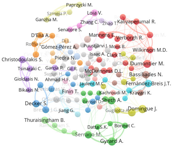 The author collaboration network in the field of interoperability and the semantic web is depicted in Figure 4. The size of each node in this network corresponds to the total number of publications by each author. In contrast, the thickness of the edges is proportional to the number of co-authored publications. A highly dispersed network is indicative of the authors’ lack of close collaboration in the field under study. The authors are clustered into 60 research communities via the network. These authors are either part of a few scattered co-authorship teams or are entirely disconnected from the other authors, implying that co-authorship is uncommon in this research field. As a result, the most productive authors are more likely to be associated with dense communities with weak co-authorship associations outside their scientific neighborhoods. By and large, the structure of the co-authorship network in the field of interoperability and the semantic web is comparable to that of other networks in other domains of knowledge [69,70].