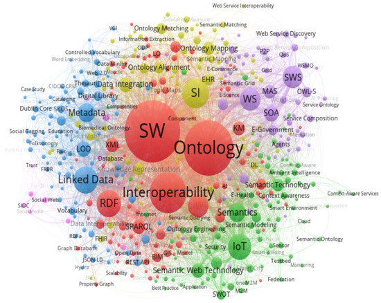 We conducted a keyword co-occurrence network analysis to better understand the interoperability and semantic web research. Like a co-citation network, a keyword co-occurrence network illustrates the co-occurrence of keywords and their relationships [64]. According to [65], analyzing this network enables researchers to identify research topics and document the transition of research frontiers within a particular field of study. If two keywords appear more frequently in the same publications, they have a stronger relationship. By creating the keyword co-occurrence network, we hoped to analyze the core content of the keywords used and better understand the research structure at the intersection of interoperability and the semantic web. VOSviewer was used to visualize the co-word network because it is highly recommended and compatible with the BiBExcel software package. The node’s size corresponds to the frequency of each keyword, while the thickness of the edges indicates the frequency with which each pair of keywords appears in publications. This approach was used in the current study to describe and analyze the keyword co-occurrence network. Visualizing the associations between keywords made it possible to deduce the topics related to interoperability and the semantic web.