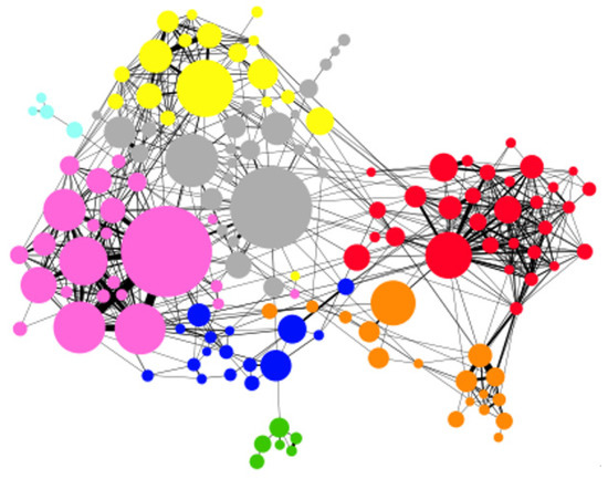 - Blondel, V.D.; Guillaume, J.-L.; Lambiotte, R.; Lefebvre, E. Fast unfolding of communities in large networks. J. Stat. Mech. Theory Exp. 2008, 2008, P10008. [Google Scholar] [CrossRef] [Green Version]