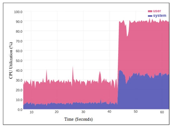 In SDNs, a table miss occurs upon the arrival of a new packet which the data plane does not know how to handle, i.e., there is no matching flow entry installed in the flow table of the switch. As a result, a Packet-In message is generated. Depending on the switch memory status, this Packet-In may comprise the header of the received packet when the switch memory is not full, or the whole packet is encapsulated in the Packet-In message and passed to the controller if the switch memory is full. After receiving the Packet-In message, the controller decides the fate of the table-miss packet by sending Packet-Out and Flow-Mod messages to install flow rule(s) in the flow table of the OpenFlow switch. This reactive packet processing exposes a security vulnerability. An attacker may exploit table miss to exhaust the control and data planes’ computational resources (i.e., CPU and RAM) and flood the OpenFlow channel by launching a data-to-control plane attack. The saturation effect of this attack is caused by generating and sending vast amounts of Packet-In messages to the SDN controller which drastically consumes the controller’s computational resources. Figure 1 shows the CPU utilization of the SDN controller under the UDP flooding attack. Before the attack started, the CPU utilization of the control plane ranges from (20–40%). When the UDP flooding attacks are triggered, the CPU utilization reached up to 90% since the controller is overwhelmed by processing the malicious Packet-In packets.
