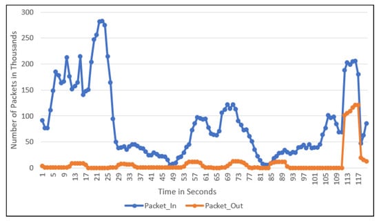 From the captured OpenFlow traffic, four features are extracted: the number of Packet-In messages, the number of Packet-Out messages, the number of Flow-Mod messages, and the number of TCP-ACK messages exchanged between the switch to the controller. The extracted features are sensitive to saturation attacks as well as hybrid saturation attacks, which are mainly a combination of different saturation attacks that target the SDN environment. The saturation and hybrid saturation attacks have a different impact on these features. Figure 3 demonstrates the impact of the UDP attack on the presence of the Packet-In and Packet-Out messages on the OpenFlow traffic. At the early stages of the attack, the number of the Packet-In messages increases significantly since the attack packets do not match the flow rules of the OpenFlow switch (i.e., table miss), which leads to generating Packet-In messages that are forwarded to the SDN controller. At the later stages of the attack, the number of Packet-In messages will be dropped followed by an increase in Packet-Out messages generated by the controller as a response to the generated Packet-In message at the early stages of the attack. It is highly important to note here that the SDN controller cannot process every Packet-In message in timely manner and generate a Packet-Out message due to the negative impact of the attack on the SDN environment computational resources. Table 3 explains the impact of TCP-SARFU, UDP, TCP-SYN, ICMP, and IP spoofing attacks on each feature.