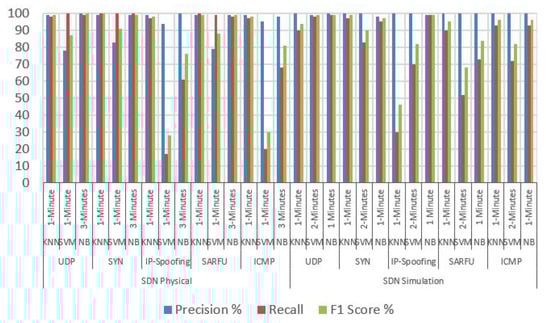 For the physical environment, 30 datasets were extracted using the collected OpenFlow traffic. Each dataset corresponds to a different time window of OpenFlow traffic analysis. The time windows range from 1 min to 30 min. Each dataset was used to train and test K-NN, NB, and SVM classifiers. The recall, precision, and F-1 score were employed to evaluate the detection performance of our trained models and analyze the impact of different time windows on the prediction results of our models.