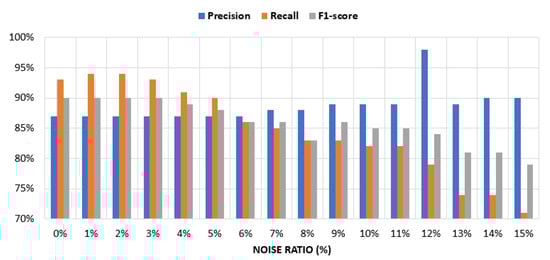 This section investigates the variational autoencoder robustness against the noise of the training dataset. The variational autoencoder assumes that all the training examples belong to a unique class, in our case, benign examples. However, during the initial setup of the saturation attack detection systems, some machines are connected to the SDN network, which may have abnormal behavior or, during data collection, some attacks are already perpetrated. Therefore, we conducted multiple experiments using the variational autoencoder with a training dataset that includes a small percentage of attack observation (i.e., noisy samples), which are very close to the benign ones. The attack examples are selected by using the k-nearest neighbor data structure, which was trained using benign examples. Figure 7 and Figure 8 show the detection performance results of the variational autoencoder in terms of precision, recall, and F1-score with different noise percentages, for both physical and simulated SDN environments. We can observe that the variational autoencoder is robust and maintains comparable high performance, even with a high noise ratio. We also observe that the physical experiments demonstrate better robustness than the simulated experiment. In fact, with noise, the F1-score and recall are smaller than , while in the simulated experiments they are always above . Therefore, we chose to utilize the variational autoencoder in our hybrid approach.