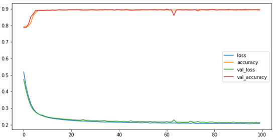 As the loss function and optimizer, binary cross-entropy was used. The binary cross-entropy, also called log-loss, is a loss function that is well suited for binary classification tasks, as it compares predicted probabilities to actual classes by measuring the distance between the prediction and actual output when training and the computed log-loss shows how close or far the prediction is to the actual values [32].