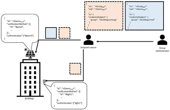 A group is administrated by a group administrator and involves multiple IoT endpoints. Moreover, a group is associated with a did:self DID denoted by and a Fully Qualified Domain Name (FQDN). The DID document of a includes the assertion verification method: the public key defined in this method can be used for verifying VCs issued by the group administrator. A group may include endpoints from multiple owners. Group administrators are responsible for controlling which owners can can be part of a group.