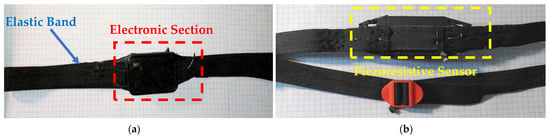 The electronic conditioning and acquisition section’s printed circuit board (PCB) was developed; then, the piezoresistive chest band prototype was assembled starting from a plain elastic band using a piezoresistive sensor (Figure 4a). On the elastic band and above the piezoresistive sensor a 3D-printed plastic case (having size 7 × 3 × 1.5 cm) is installed. This case houses the electronic section, and was properly designed to be comfortable and wide enough to host the board and not conflict with the piezoresistive sensor (Figure 4b). In particular, the case is fixed through two slots to a secondary elastic band sewn over the piezoresistive sensor to avoid sensor extension due to the hindering of chest wall movements by the case. Furthermore, a 3-axis accelerometer and 3-axis gyroscope (MPU-6050) is installed under the plastic case’s cover (Figure 4c).