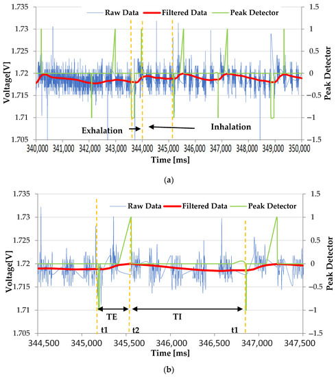 Figure 9 shows the waveforms acquired along the processing chain implemented by the developed chest band. The blue trace represents the raw voltage signal taken by the piezoresistive strain sensor, whereas the red trace is the signal filtered by the second-order Butterworth filter used to eliminate all the high-frequency components caused by external factors, such as electromagnetic noise or body movements as precordial motion. Notably, a periodic signal is obtained at the filter output, characterized by a frequency range from 0.2 to 0.6 Hz, due to the abdomen movements induced by the inflation and deflation of the lungs during the breathing cycle (Figure 9a) [54]. During the abdomen expansion due to air inspiration, the piezoresistive sensor undergoes tensile stress, leading to a reduction in its electric resistance and thus of the detected signal. Conversely, the signal increases during the expiration; due to the abdomen’s shrinkage, the stress on the piezoresistive sensor is released, increasing the sensor resistance and thus the output signal (Figure 9a). In addition, the band was tested over light clothing (T-shirts), and no significant variation of the signal amplitude from the piezoresistive sensor was observed. In addition, since the peak detection algorithm is based on statistical data analysis, and evaluates the deviation in the points from the moving average, the processing chain is relatively insensitive to slight reductions in the signal amplitude, thereby ensuring the correct operation of the device. Finally, the green trace is the output of the peak detector algorithm operating according to the dispersion principle; specifically, it indicates the exhalation and inhalation instants used by the firmware to derive the respiratory parameters. The peak detection algorithm records each data point based on a set number of standard deviations from the moving average (called the z-score). Since this algorithm works on the moving average of the recorded data points, and detects the deviation of the signal from the moving average, it automatically adapts to changes in the amplitude of the acquired signals. This mechanism ensures the correct operation of the chest band for different levels of band tightness on the user’s chest. The graph reveals the voltage fluctuations produced by the piezoresistive signal that are attributable to the expansion and contraction of the chest (Figure 9a).
