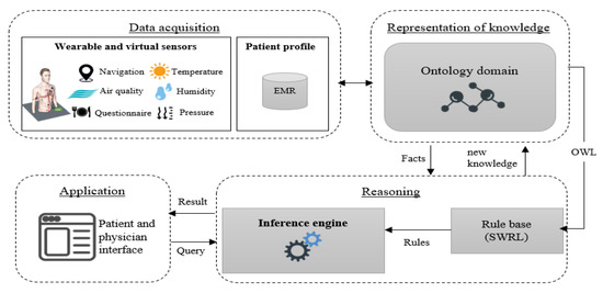 The data acquisition layer is aimed at collecting the medical profile of asthma patients, foods, and environmental information from active or passive sensors. The representation layer is an ontological schema that has been used to translate the gathered information into machine understandable data. The reasoning layer is the brain of this system where all the inference processes are carried out through predefined medical rules. The application layer includes the functions and services offered by the system. All these layers are discussed in further detail in the following sections.