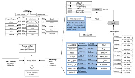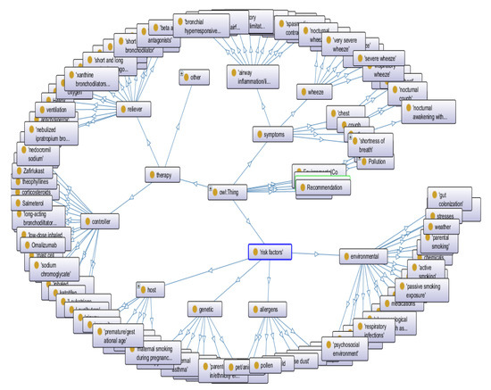 At this level, the proposed ontology is mainly related to fundamental ontologies presented in COPDology, BioPortal, FoodOn, and SNOMED-CT [29]. These ontologies can be easily combined to cover further domains such as asthma disease. Thus, our asthma ontology is an integration of several ontologies relevant to interpreting the risk factors: