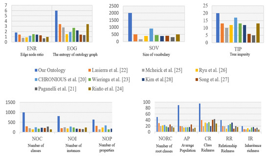 Evaluation of ontology: There are many criteria and metrics to evaluate ontology. These characteristics measure the complexity of our ontology on both class and ontology levels. Ontology engineers compare their structure against a “gold standard” reference. The evaluation values presented in Figure 3 belong to some medical ontologies [31,32,33,34,35,36,37,38,39]. At the level of ontology, the size of vocabularies (SOV) of our ontology exceeds 1800 concepts. As a first step of our ontology, the edge node ratio (ENR) of our work is more useful than the other ontologies, but, in fact, our ontology could be more complex. The TIP value is a rational indicator of inheritance relationships. The TIP value of our ontology reaches 20, which means that this inheritance hierarchy deviates significantly from the tree root. The entropy of the ontology graph (EOG) corresponds to the distribution of relations. The EOG of our ontology is almost 2, thus it has a relatively acceptable structure. At the class level, the number of classes (NOC) and the number of instances (NOI) are 180 and 4000, respectively. The high number of properties (NOP) supports the reasoning engine [40]. The number of root classes (NORC) in this ontology refers to the great diversity found in this structure. The high value of AP is a good indication that our semantic representation has enough information. CR is 90, which means that most of the classes have instances. This description of knowledge is very rich, where its RR is equal to 40. The high inheritance richness (IR) reflects the vertical and detailed nature of representation. For more details, please refer to [30].